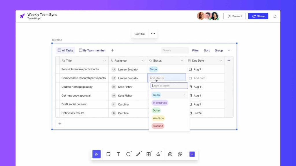 Tables is a flexible data view that caters to your team’s specific workflow needs, with custom properties like people, tags, dates, links, and more. Configuration options let you filter, sort, search, and group tasks and data more efficiently. And, Tables seamlessly integrates into the Intelligent Canvas with the ability to absorb data from other smart objects like cards and people stickers — turning collaboration into action.